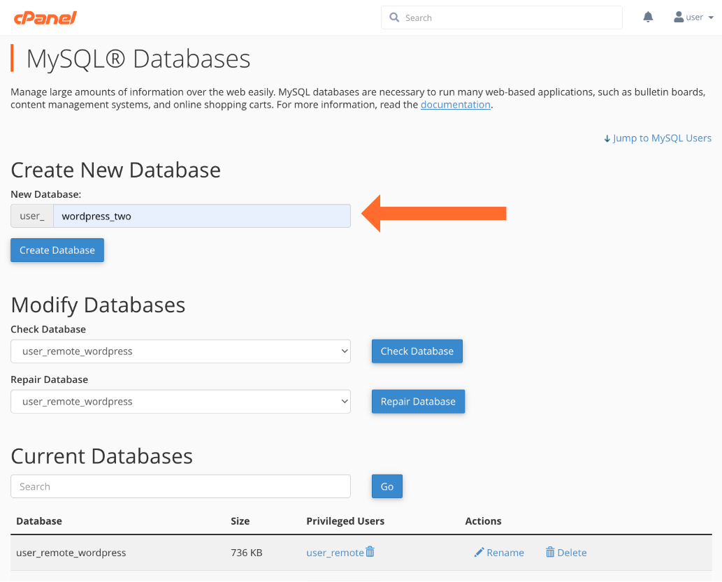 - Open MySQL Databases, which you’ll find under Databases the main page menu.