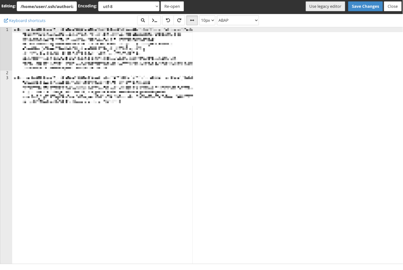 Log in to your cPanel account and open the File Manager, which you’ll find in the Files section of the main page menu. Browse to the .ssh folder, select the authorized_keys file, and click the Edit button in the toolbar.