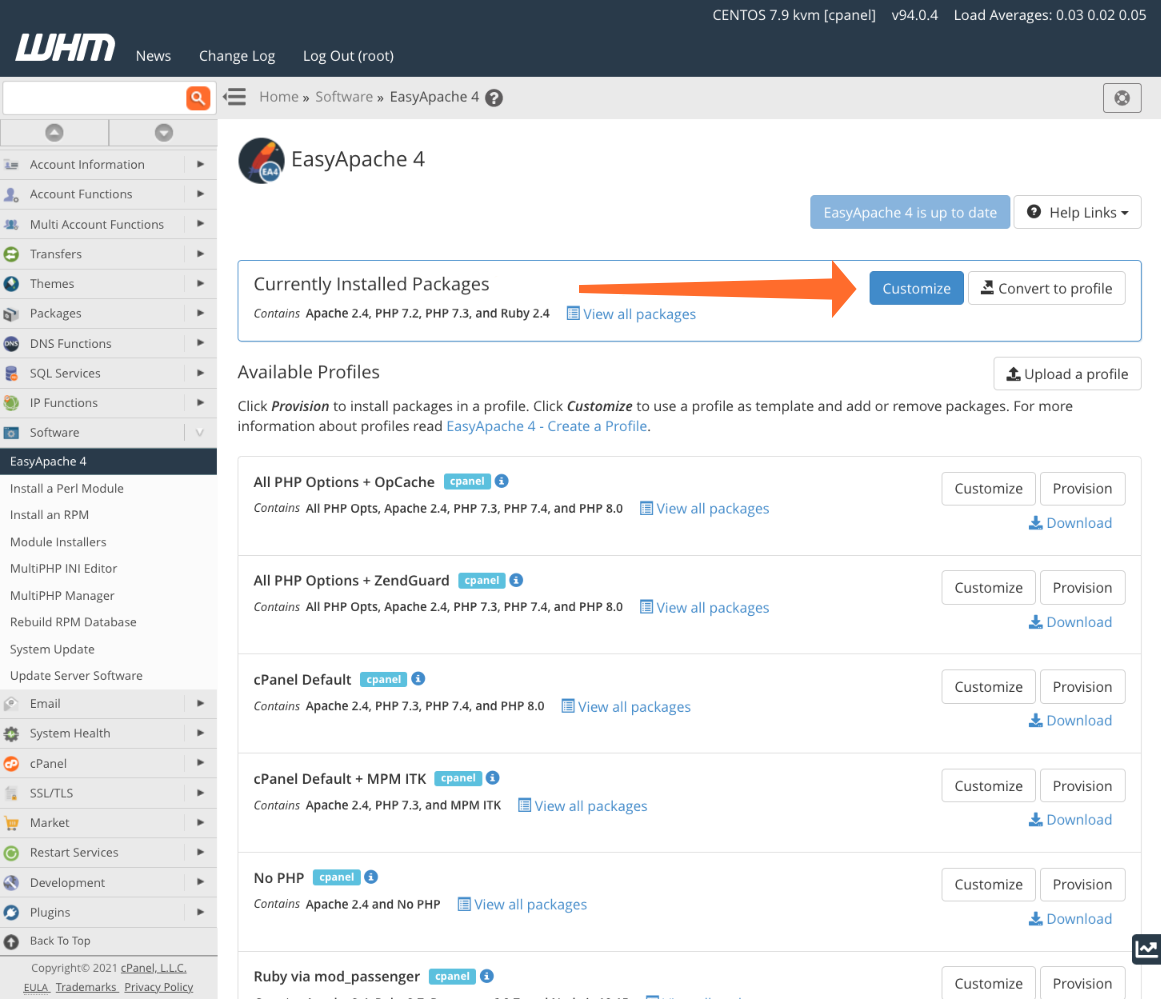 Select EasyApache 4 from the WHM sidebar menu. Click the Customize button in Currently Installed Packages.
