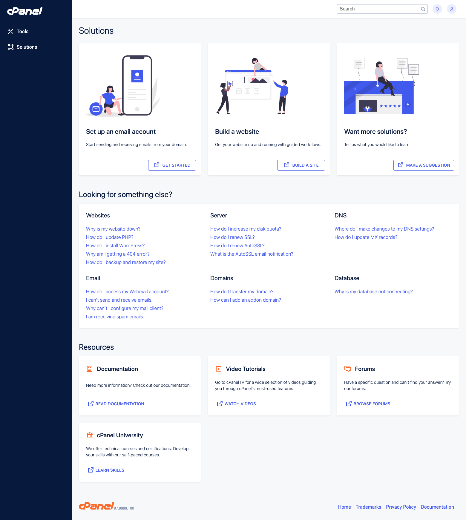 Created with first-time users in mind, the Solutions page will teach you how to use cPanel effectively and efficiently. Experienced users may also find this page to be a valuable source of information.