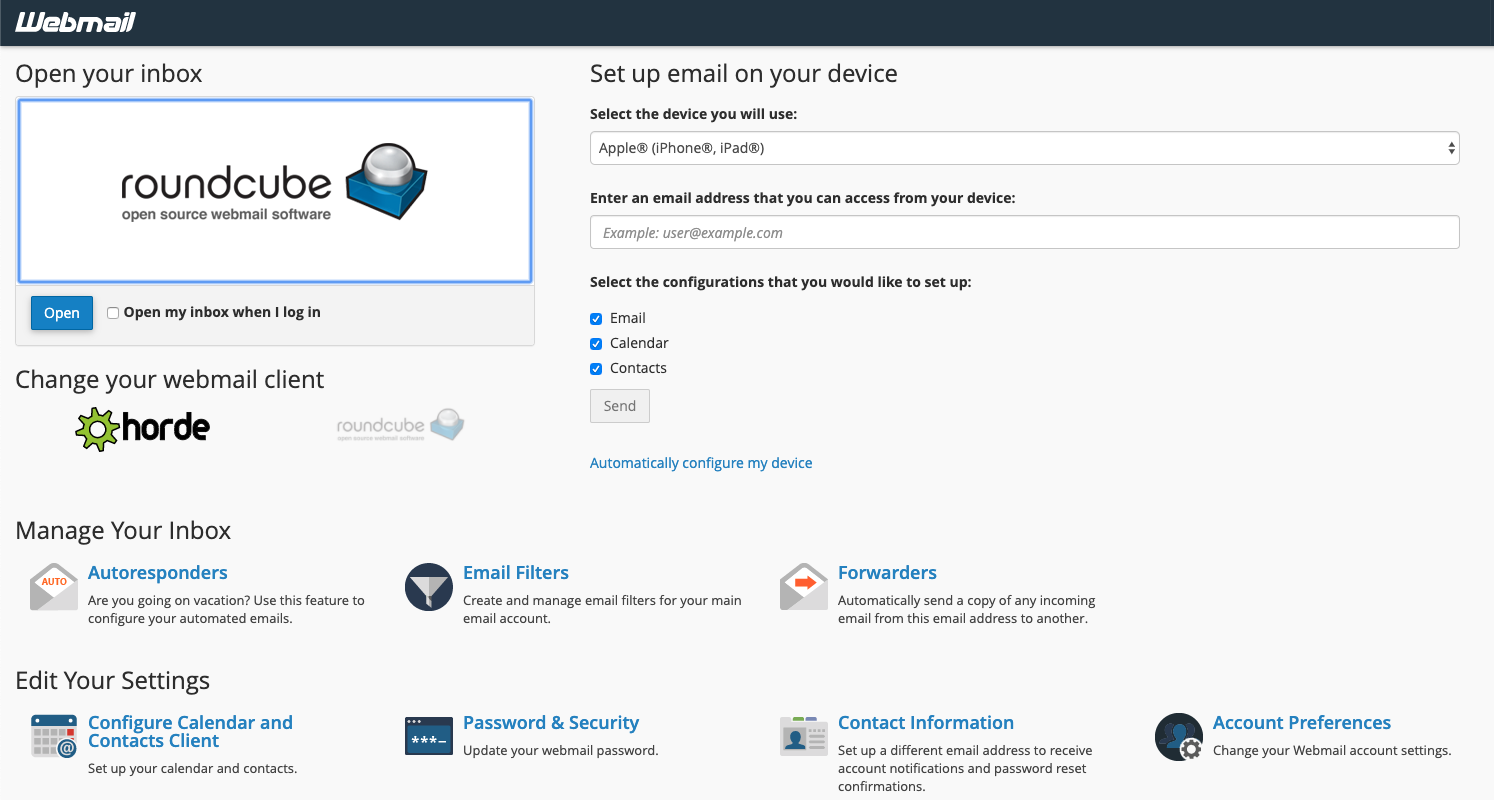 Now that you have your personalized domain email accounts created, you’ll need a way to check those inboxes! Packaged alongside cPanel & WHM is Webmail.