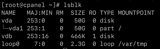 There is one other piece of information that could help us narrow things down: the mount point of the vda device. The mount point is the directory on the server’s filesystem the device is connected to. You can find it with the lsblk command.