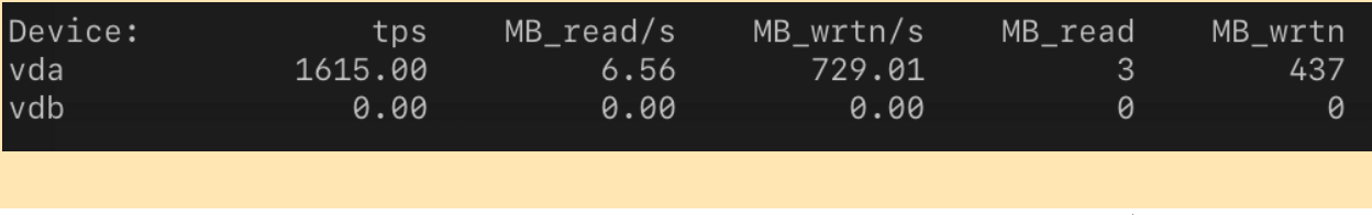 The device called vda is writing 730 MB of data each second. Whether that’s a problem depends on the capabilities of the server and the device, but with the observed performance degradation and large IO wait times, it’s reasonable to conclude that excessive disk IO on vda is the cause of our issues.