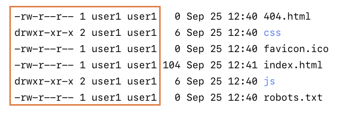 The leftmost letter indicates the filetype. Here it’s a d so we know the file is a directory. If it was a normal file there would be a dash (-) in this column, as you can see in the first image.