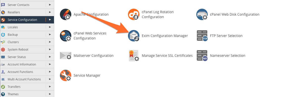 To configure Exim, open WHM and navigate to the Exim Configuration Manager in the Service Configuration section of the sidebar menu.