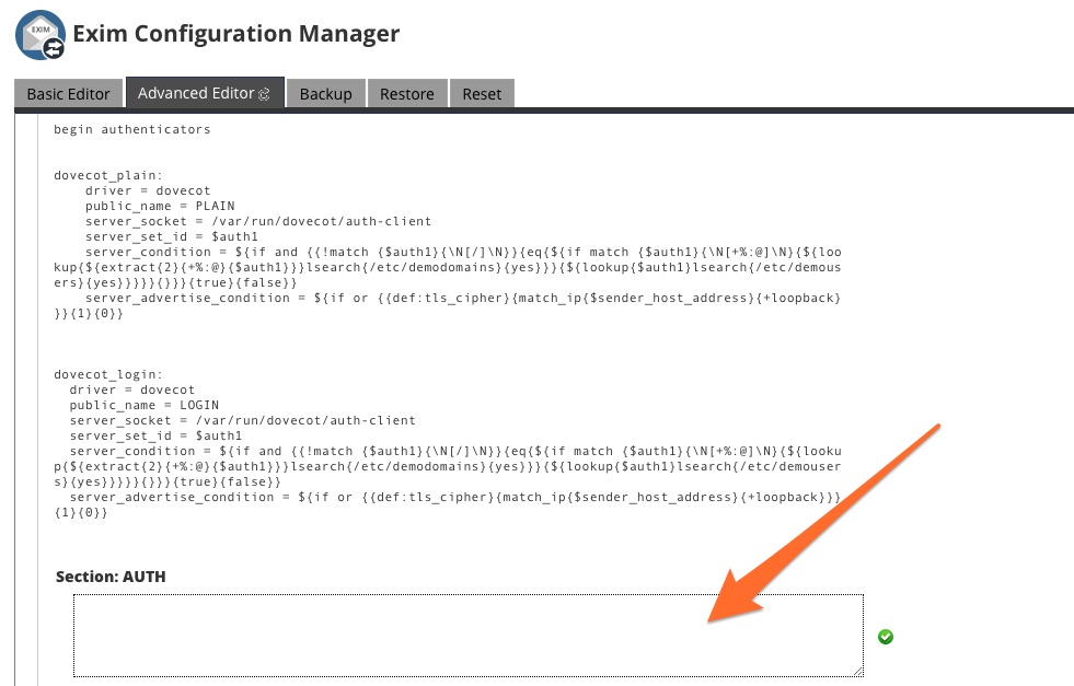 Select the Advanced Editor tab. Search for the text “begin authenticators.” Below the entries for Dovecot® is a text box, into which you should enter your authentication details.