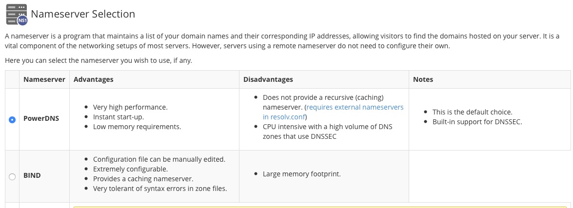 There are also options to select MyDNS and NSD, but both are deprecated and will be removed from cPanel in the future.