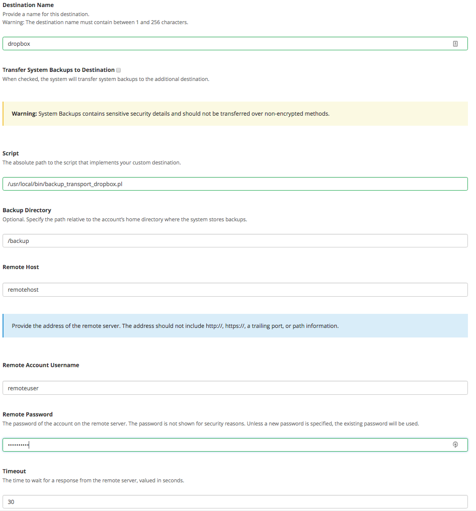 We’re now ready to configure the transport in WHM. Head over to WHM » Backup » Backup Configuration and scroll down to Additional Destinations. Under Destination Type, select Custom, then Create new destination. Configure the destination as below (note, since we’re using the API keys directly in the transport script, you can enter anything for the host, user, and password):