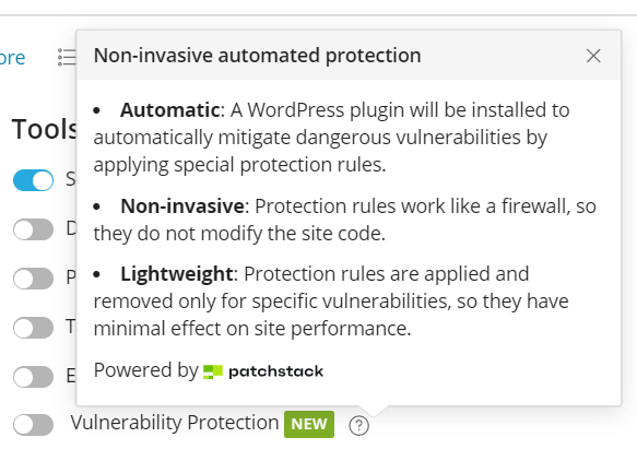 - Automated: Protection works continuously and automatically, protecting the site from current and future vulnerabilities without user involvement.